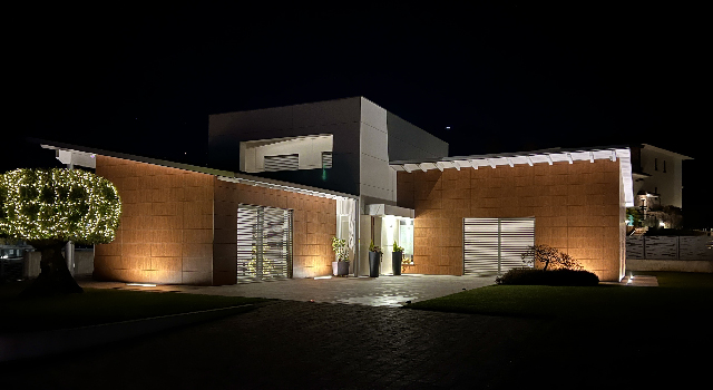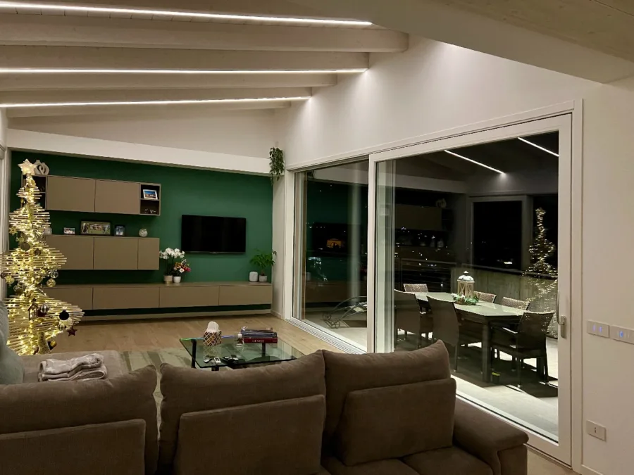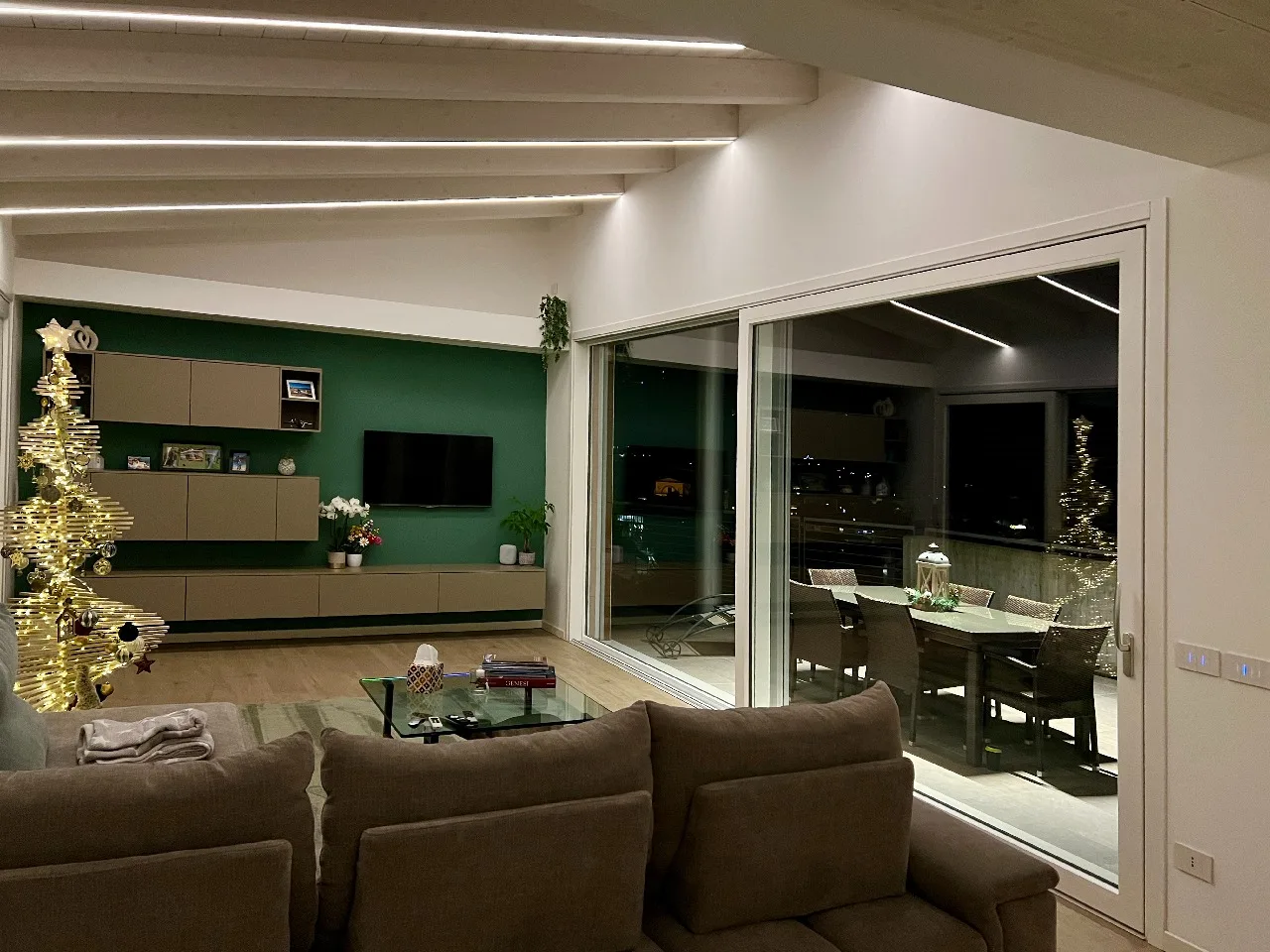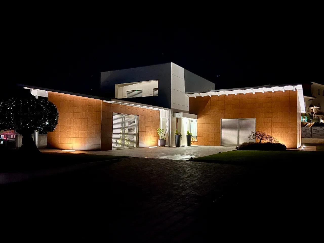 Dal punto di vista energetico, la casa è concepita come un edificio completamente elettrico. Un sistema domotico centralizzato gestisce pompa di calore per riscaldamento, raffrescamento e produzione di acqua calda sanitaria, ventilazione meccanica controllata e schermature solari, permettendo di modulare luce e calore in base alle condizioni climatiche. L’impianto fotovoltaico integrato da 9,6 kWp, abbinato a un sistema di accumulo da 30 kWh, copre una quota significativa dei consumi, rendendo l’abitazione autosufficiente per diversi mesi all’anno e garantendo continuità di alimentazione anche in caso di interruzioni della rete.