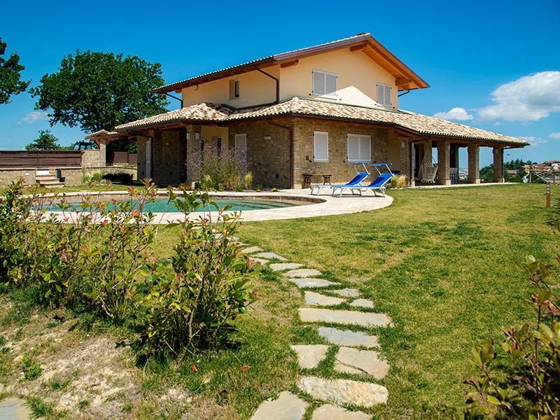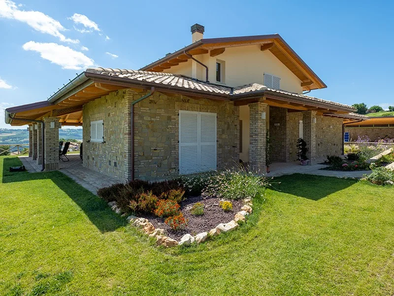 Salta subito all’occhio la finitura esterna in legno misto pietra che riporta alla tradizione ed alle case rurali tipici della nostra regione.