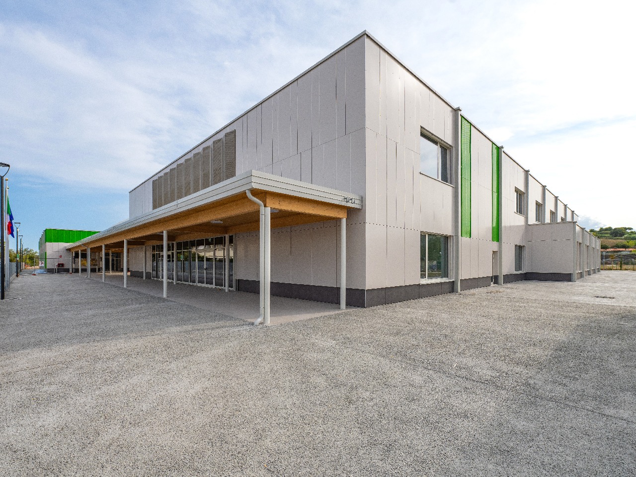 Il campus si sviluppa su circa 18.500 mq e ospita tre strutture principali: la scuola secondaria, la scuola dell’infanzia Arcobaleno e una palestra scolastica-palazzetto omologata CONI, completate da archivio esterno e spogliatoi. La sostenibilità e il comfort sono stati al centro del progetto: l’edificio principale è Classe Energetica A4 NZEB, dotato di impianto fotovoltaico da 40 kW, riscaldamento a pannelli radianti alimentati da pompa di calore e pareti in platform frame con pannelli in materiale composito a base di roccia basaltica. La struttura è progettata in Classe d’uso sismica IV e utilizza il legno come materiale naturale, rinnovabile e riciclabile. Comfort acustico, climatizzazione con ricambio d’aria e sicurezza idraulica completano l’ambiente interno.