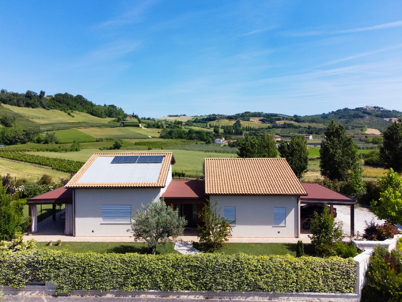 Nel cuore delle Marche, ad Ortezzano (FM), abbiamo realizzato una villa monofamiliare in legno lamellare che rappresenta un perfetto equilibrio tra bioedilizia, tecnologia costruttiva e design su misura. L’intervento nasce con un obiettivo chiaro: offrire un’abitazione sostenibile, efficiente e perfettamente integrata nel paesaggio marchigiano, capace di coniugare comfort abitativo e rispetto per l’ambiente.