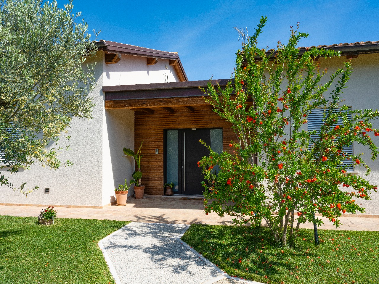 La villa si sviluppa su di un unico piano di circa 180 metri quadrati, trovano spazio ambienti ampi, funzionali e completamente personalizzati secondo le esigenze del committente. L’abitazione dispone inoltre di due soppalchi rispettivamente di 32 e 37 metri quadrati, che ampliano la fruibilità interna e donano ulteriore profondità e dinamismo agli spazi. Due portici coperti, di 37 e 41 metri quadrati, completano la struttura e favoriscono la continuità tra interno ed esterno, creando un legame armonioso con l’ambiente circostante.