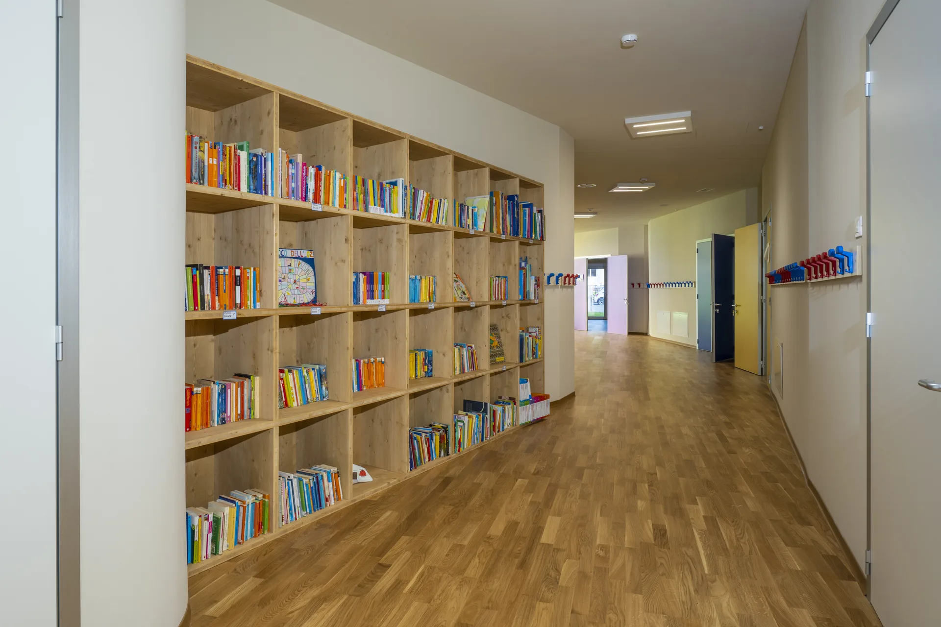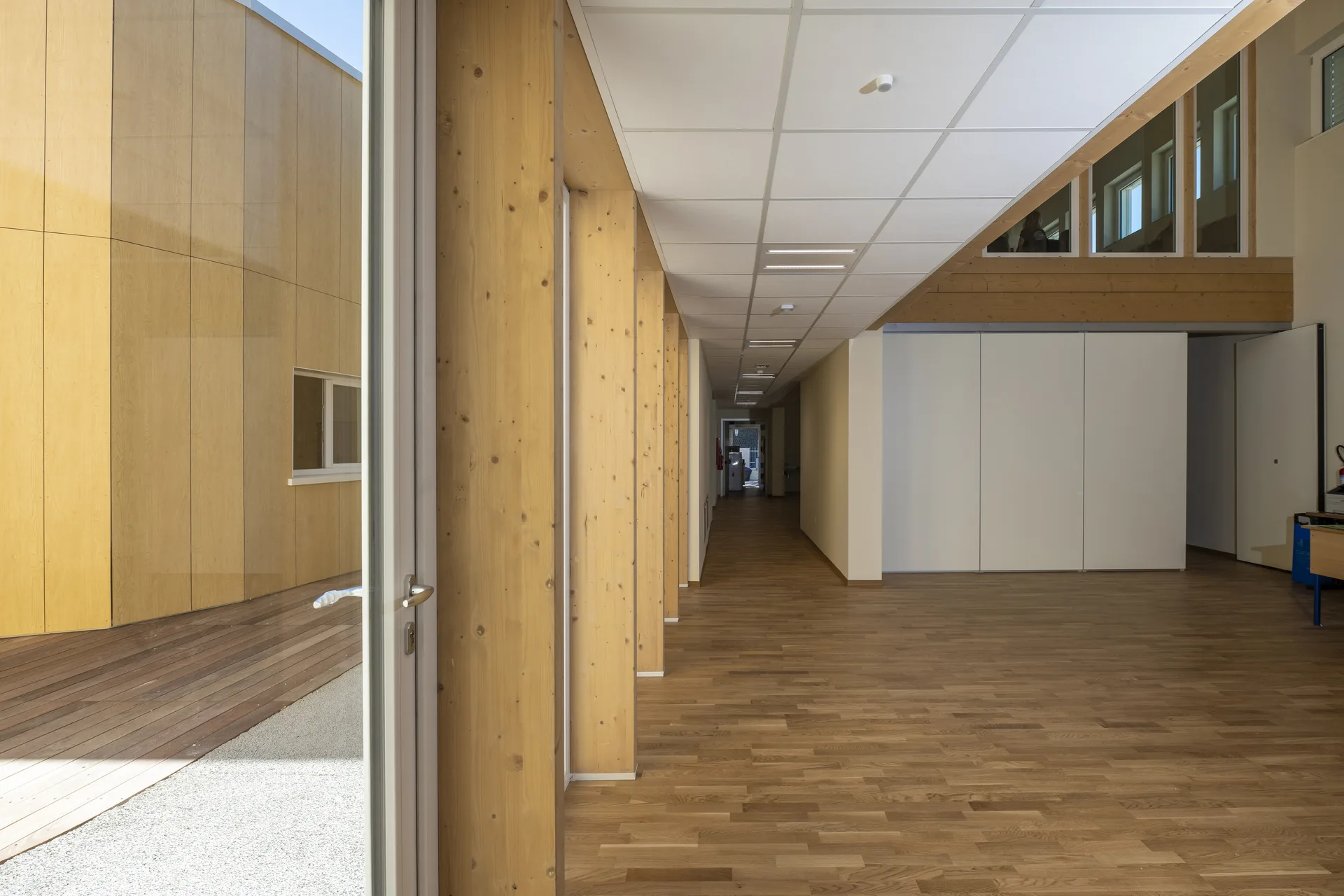 Gli spazi interni sono organizzati per favorire percorsi didattici fluidi, attività collettive e momenti di concentrazione, con aperture studiate per massimizzare luce naturale e connessioni visive con il contesto. Materiali e soluzioni costruttive sono scelti per garantire efficienza energetica, comfort termo-acustico e durabilità, mentre la composizione degli spazi accompagna in modo naturale i diversi usi della scuola.