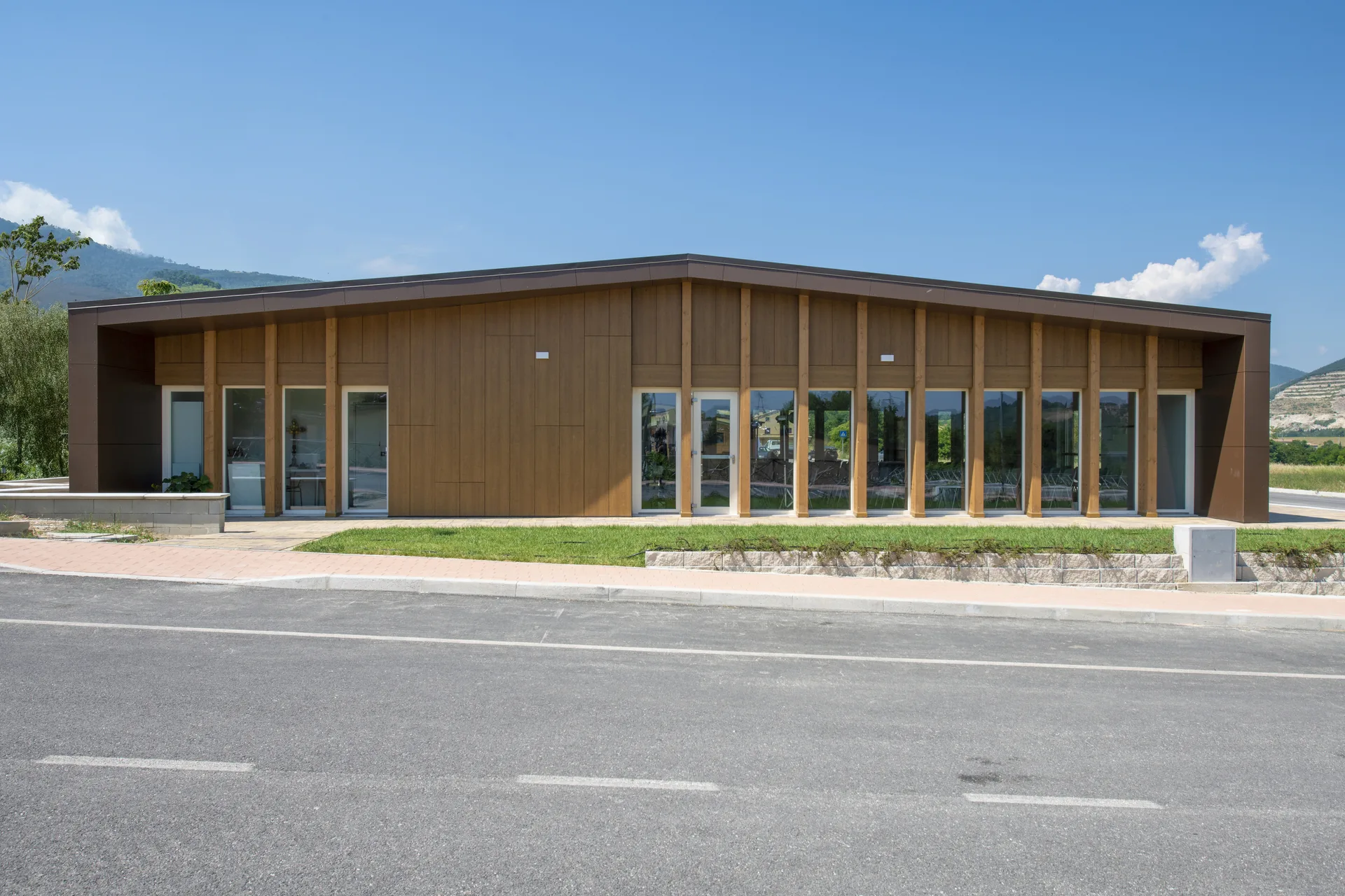 La scelta compositiva si fonda su un linguaggio architettonico misurato, sobrio ma contemporaneo, che valorizza la materialità e la costruzione come elementi di relazione con l’ambiente circostante.