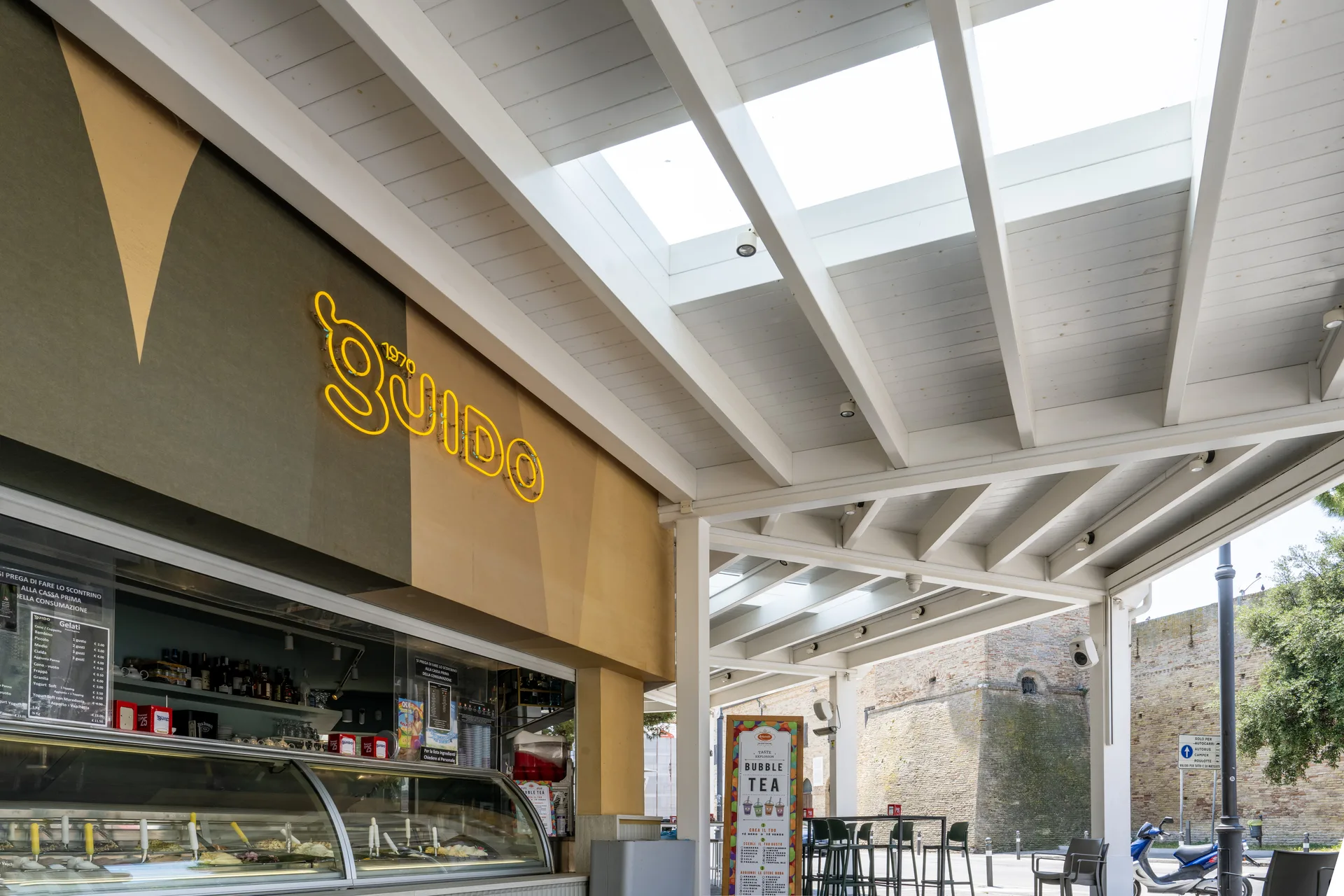 Nel cuore di Piazza Brancondi, la piazza principale di Porto Recanati (MC), abbiamo dato nuova vita a uno dei locali più amati e iconici della città: il Bar Gelateria Guido. Dopo un importante intervento di demolizione e ricostruzione, lo storico locale è stato completamente rinnovato grazie a una struttura in legno, che coniuga estetica, sostenibilità e qualità costruttiva.