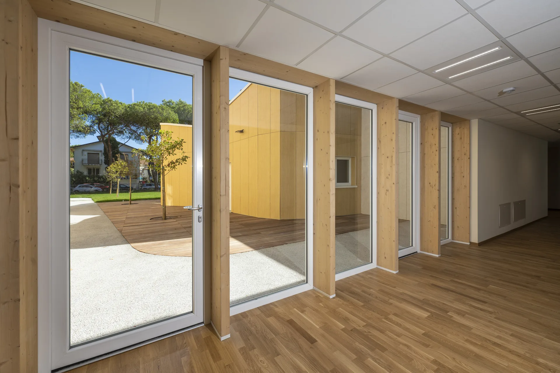 Gli spazi interni sono organizzati per favorire percorsi didattici fluidi, attività collettive e momenti di concentrazione, con aperture studiate per massimizzare luce naturale e connessioni visive con il contesto. Materiali e soluzioni costruttive sono scelti per garantire efficienza energetica, comfort termo-acustico e durabilità, mentre la composizione degli spazi accompagna in modo naturale i diversi usi della scuola.