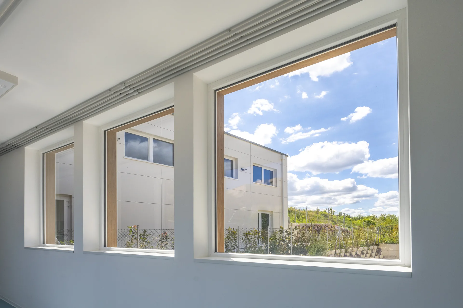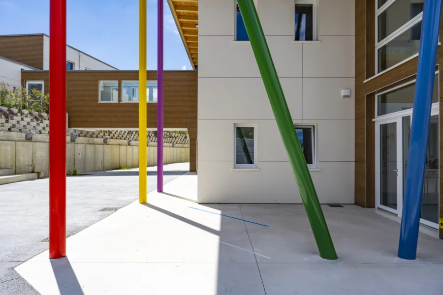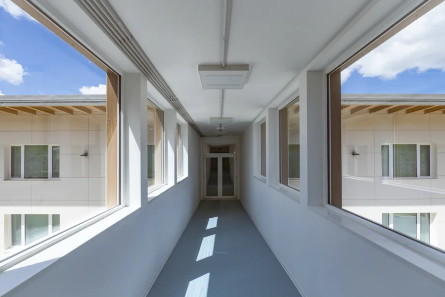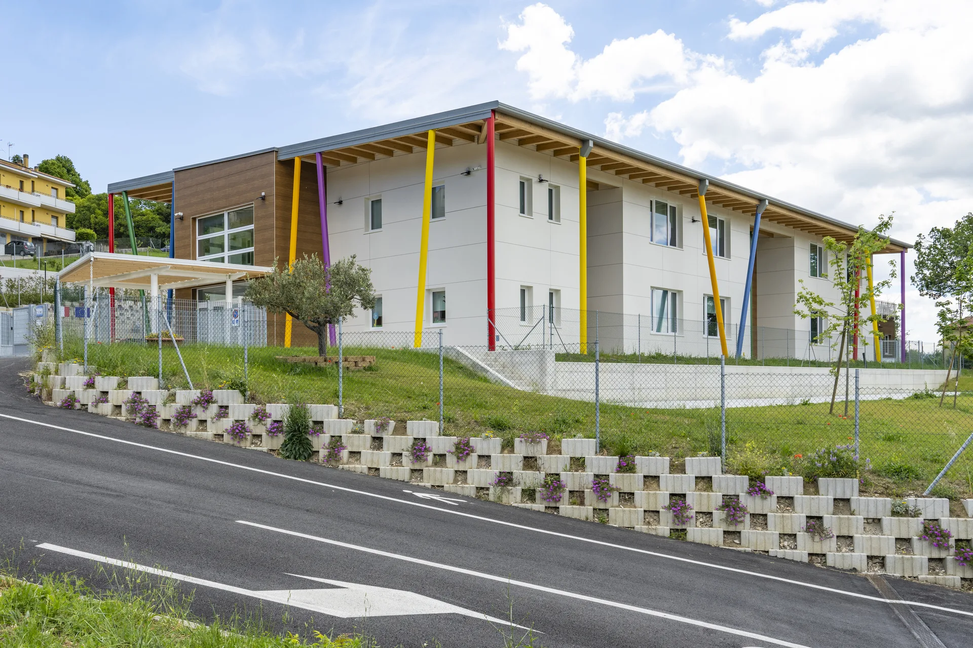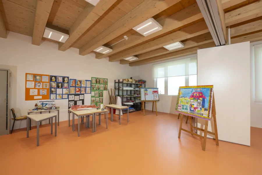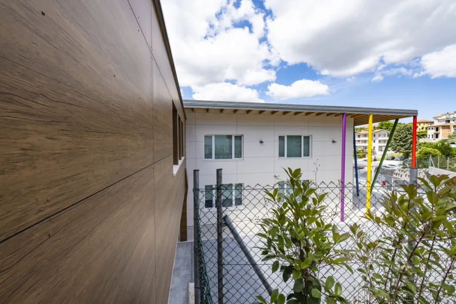 La struttura è caratterizzata da scelte costruttive orientate al risparmio energetico, al comfort interno e alla durabilità. Le ampie aperture favoriscono luce naturale e connessione visiva con l’esterno, mentre gli spazi interni sono distribuiti per facilitare relazioni, movimento e attività didattiche differenziate.