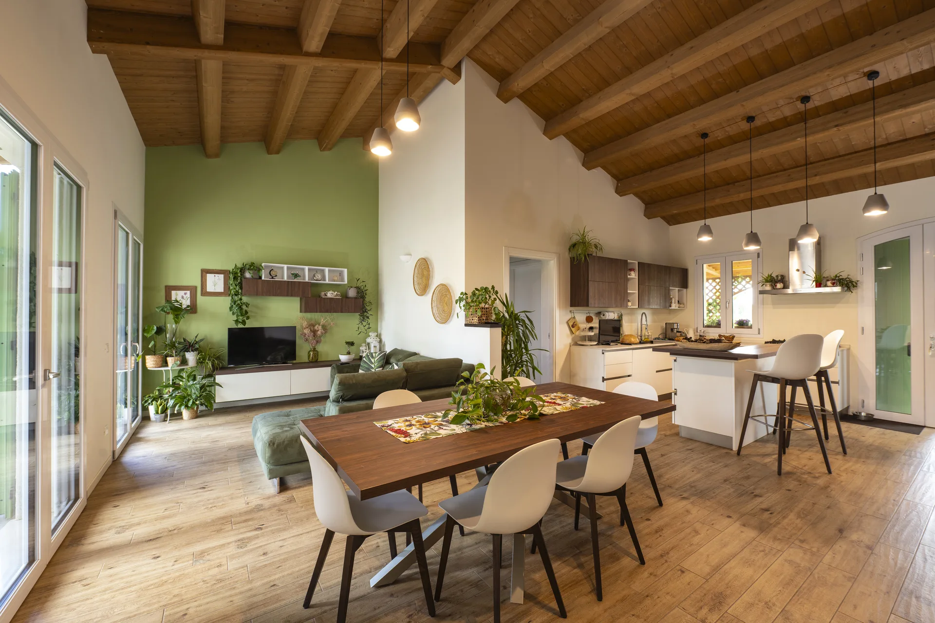La scelta del legno lamellare non è solo estetica: garantisce elevate prestazioni energetiche, isolamento termo-acustico e un ambiente interno sano, mentre la composizione degli elementi strutturali conferisce leggerezza visiva e robustezza tecnica.