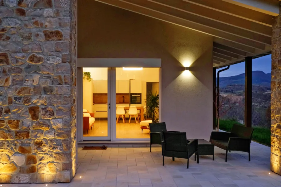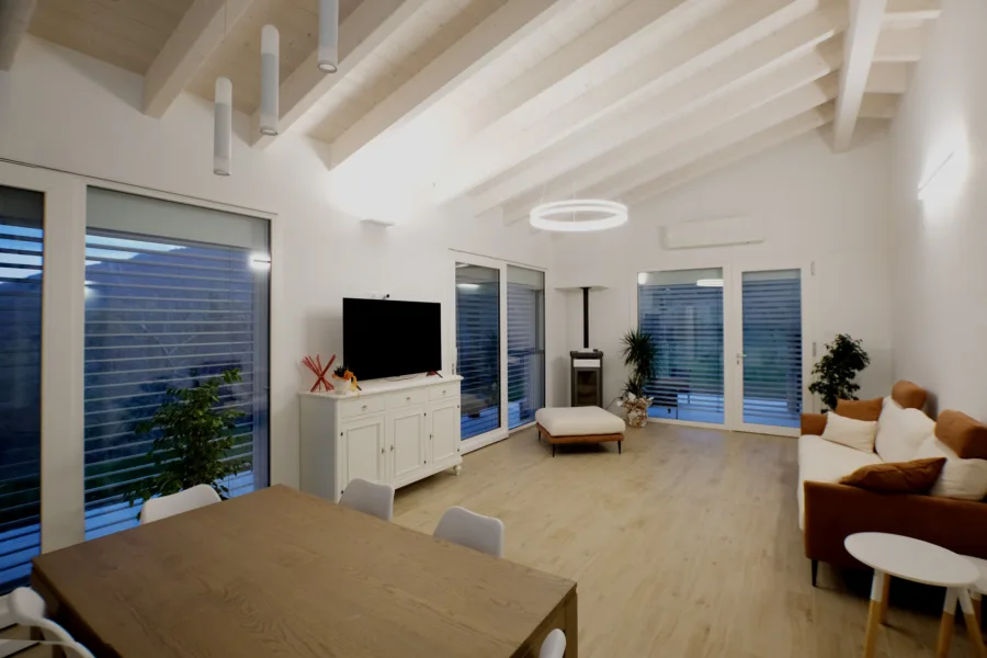 Le ampie superfici vetrate collegano gli spazi interni con il paesaggio circostante, lasciando filtrare la luce e invitando la natura a diventare parte integrante dell’abitare. I materiali naturali e le finiture curate definiscono ambienti caldi e accoglienti, pensati per durare nel tempo.