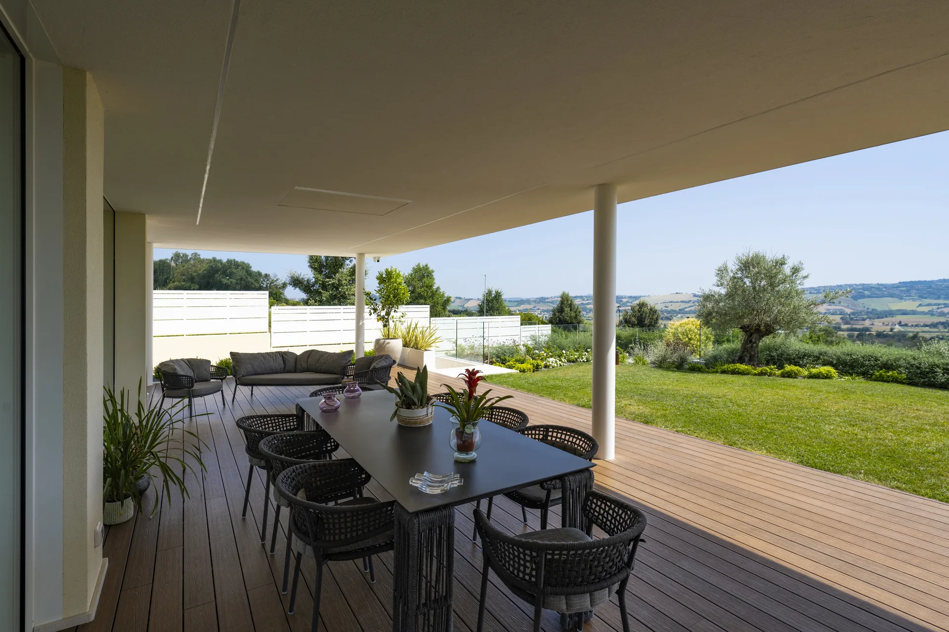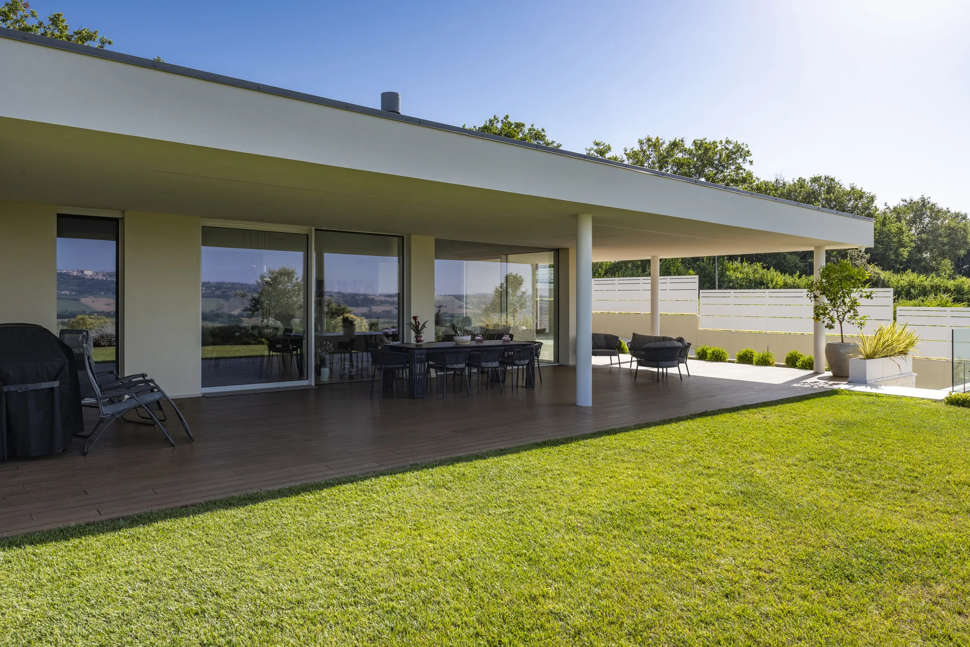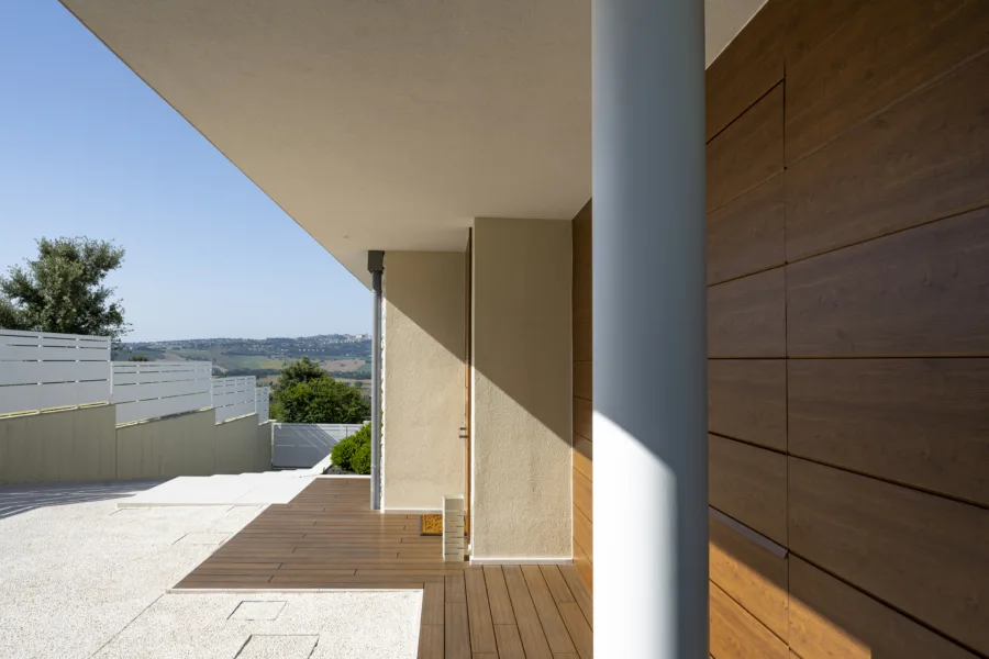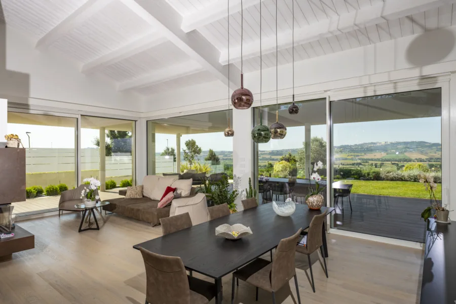 La configurazione spaziale privilegia la continuità tra interno ed esterno, con aperture studiate per valorizzare la luce naturale e creare connessioni visive con il paesaggio circostante.