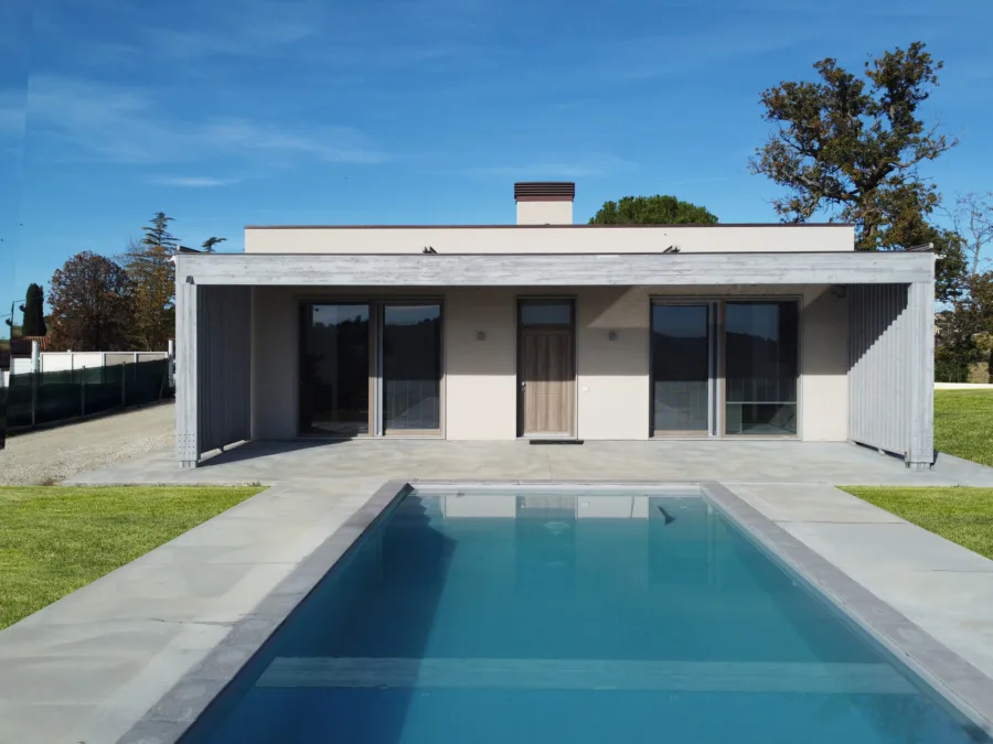 La struttura in legno, scelta per le sue qualità tecniche e ambientali, garantisce elevata efficienza energetica, comfort interno e un forte rapporto visivo con l’esterno. Gli spazi interni fluidi e luminosi si aprono sul verde, mentre i materiali naturali e le finiture curate raccontano una casa pensata per durare nel tempo.
