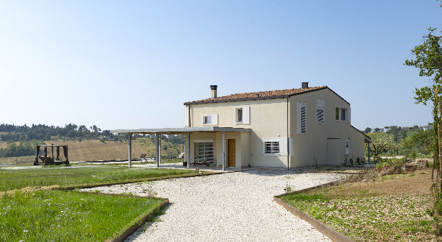 L’abitazione sorge sul sedime di un’antica casa colonica, reinterpretata secondo i principi della bioedilizia e delle moderne tecniche costruttive in legno.